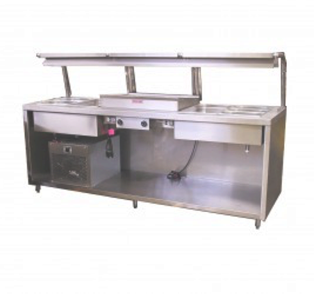 Bajo maría eléctrico con capacidad para dos insertos enteros, área para pizzas con superficie caliente y luz infrarroja, tina refrigerada con capacidad para 2 insertos enteros (insertos no incluidos) contra estornudo de lujo con iluminación mixta.
