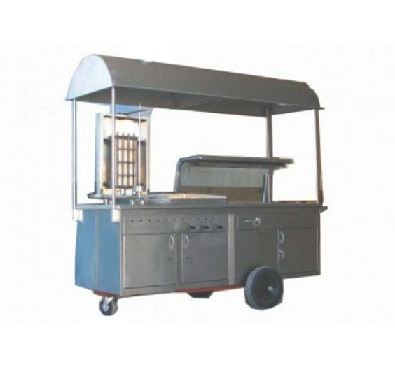 Carrito para tacos al pastor fabricado talmente en acero inoxidable esta equipado con trompo para 80 kilos fabricado en acero inoxidable, quemadores tipo jet de alta presión, plancha freidora a gas de .60 cm., contra estornudo de lujo con iluminación incandescente, repisa de acero inoxidable al frente, salsero de 4 insertos, toldo tipo campana con chimenea fabricado en acero inoxidable