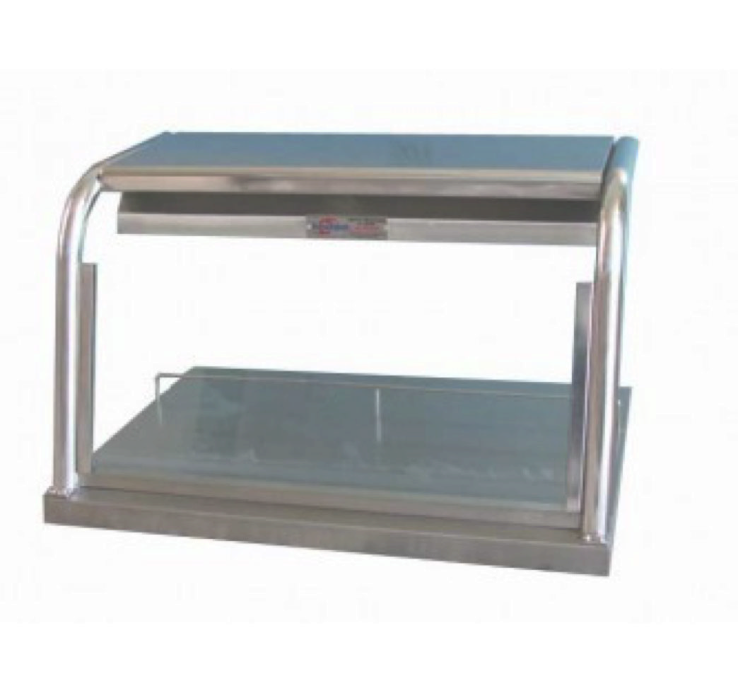 Exhibidor de pizzas fabricado totalmente en acero inoxidable con capacidad para 2 pizzas grandes de hasta 19", iluminación y calentamiento con lamparas infrarrojas. Frente de cristal de 9mm.