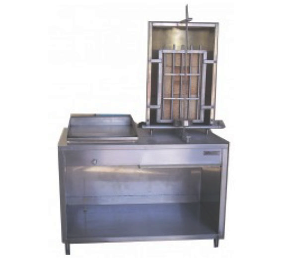 Unidad para tacos al pastor gabinete fabricado en acero inoxidable, trompo con capacidad para 80 kilos fabricado en acero inoxidable cuenta con una espada de acero inoxidable de 1/2" deflector de flama con ladrillo refractario, plancha freidora de .50 x .50 cm con reborde perimetral anti escurrimiento.